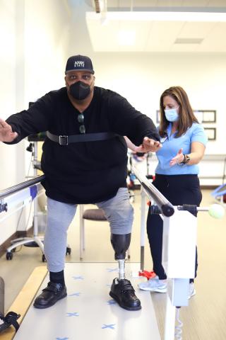 Carter took his first steps on his new leg at Methodist O&P. And despite being supported by parallel bars, “it still made me nervous,” Moss said. “That’s a lot of man. And with someone that tall, you’re usually going to have balance issues. But he’s a former athlete, and he did great.”